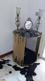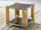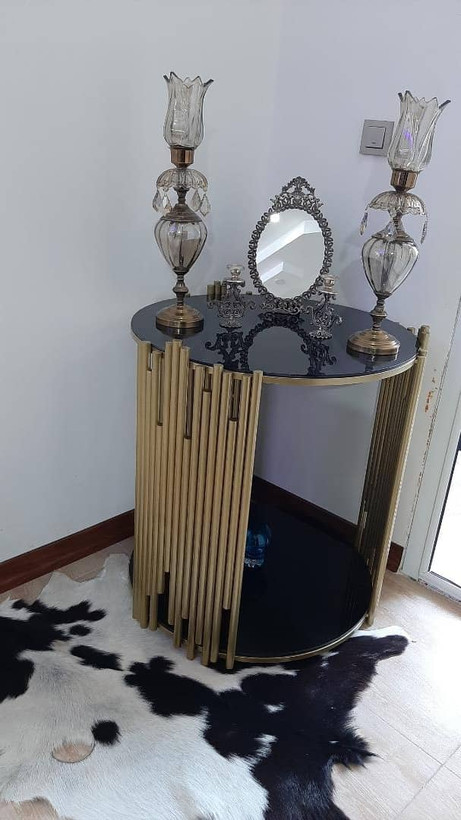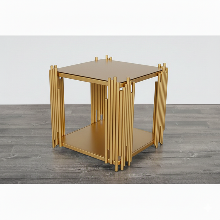 این میز کنار مبلی خاص با طراحی مدرن و هنری، ترکیبی چشمنواز از جلوهی طلایی لوکس و هندسهی خلاقانه است که در نگاه اول چشمها را خیره میکند.