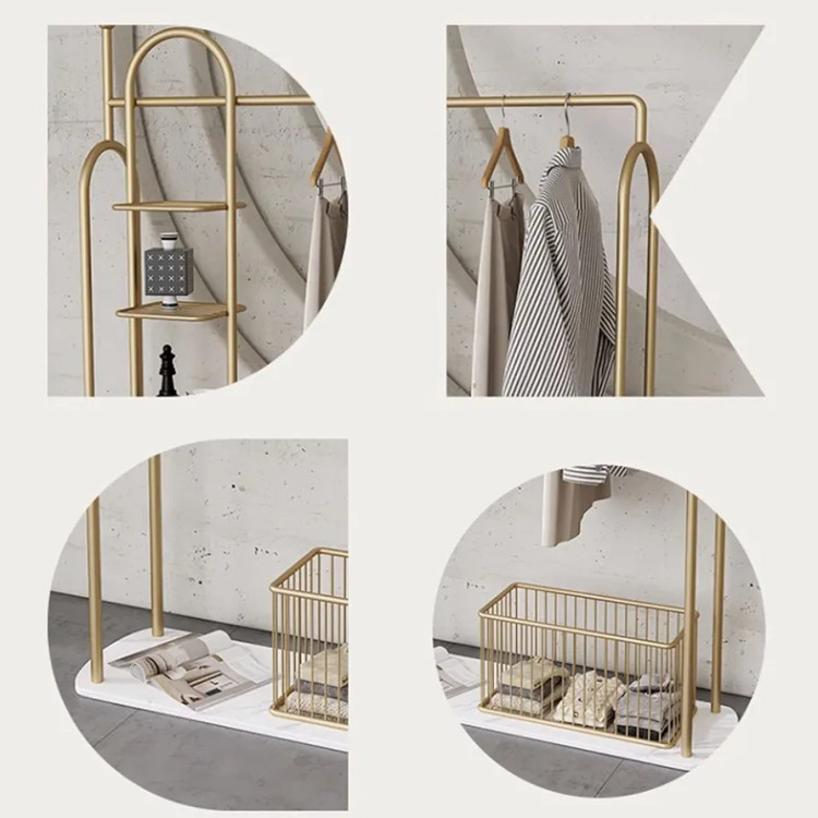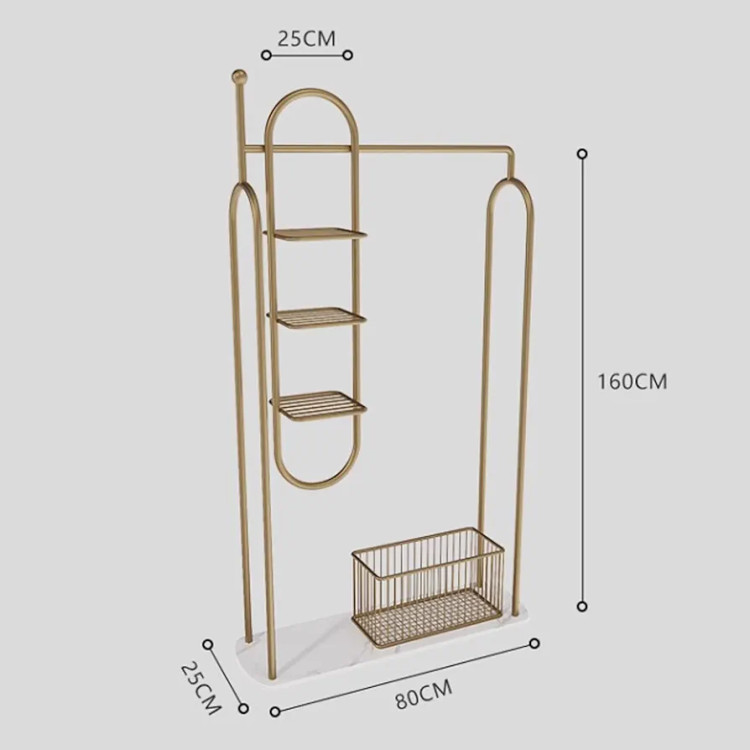 رگال لباس فانتزی طلایی دارای بدنه محکم فلزی و 3 طبقه نگهدارنده کیف و کفش با پوشش رنگ کوره ای. به راحتی در هر گوشه ای از منزل ، اتاق خواب و یا مغازه قابل ست شدن با دکوراسیون است.این رگال لباس را میتوان در قسمتهای مختلف خانه ازجمله اتاقخواب کودک