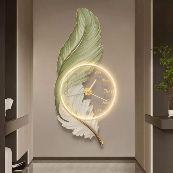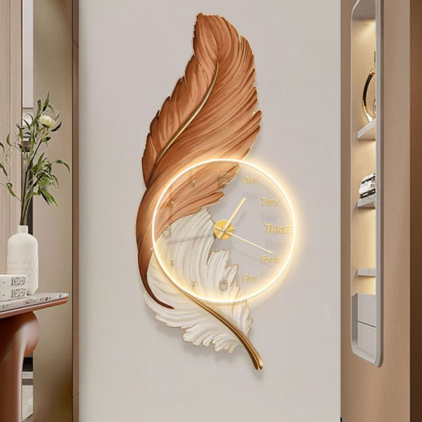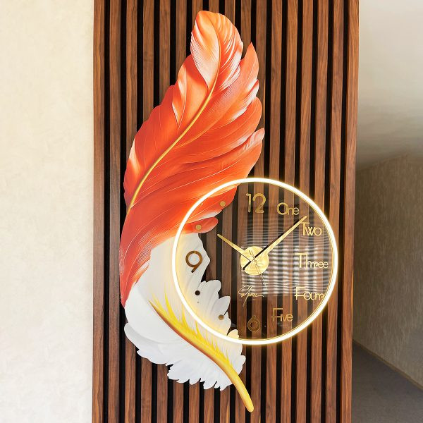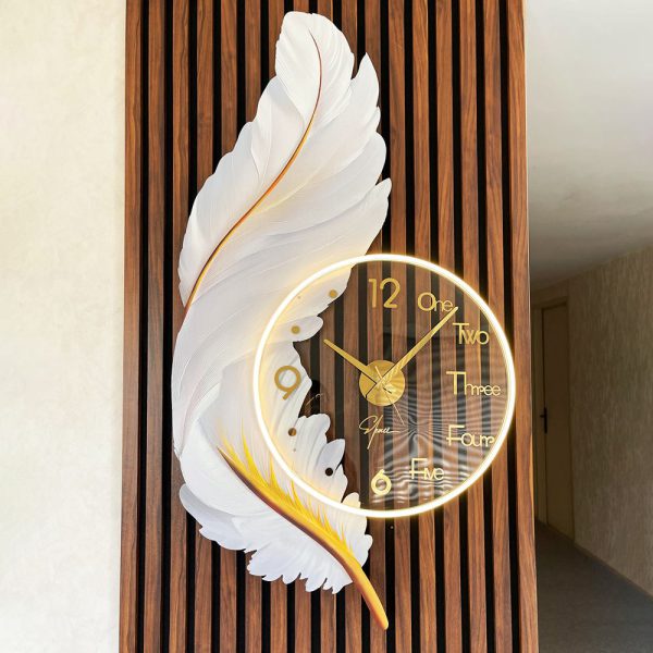 نورپردازی LED گرم: حلقه نوری دور ساعت، علاوه بر خود ساعت، بخشی از طرح پر را هم روشن میکند که باعث ایجاد عمق و سایههای زیبا روی دیوار میشود.