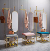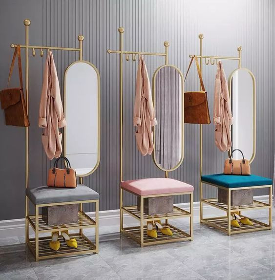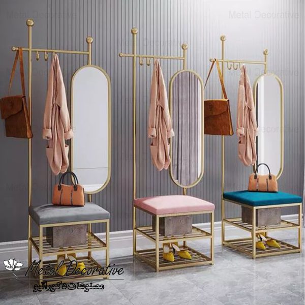 جالباسی و آویز روسری فانتزی شیک با آینه دارای بدنه محکم فلزی با پوشش رنگ کوره ای و دو طبقه برای کیف و کفش و یک پاف برای نشستن با روکش پارچه ای مخملی . به راحتی در هر گوشه ای ای از اتاق و یا بوتیک قابل ست شدن با دکوراسیون است.این رگال لباس را میتوان در قسمتهای مختلف خانه ازجمله اتاقخواب و اتاق کار قرار داد.
