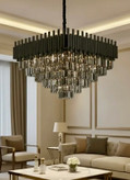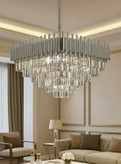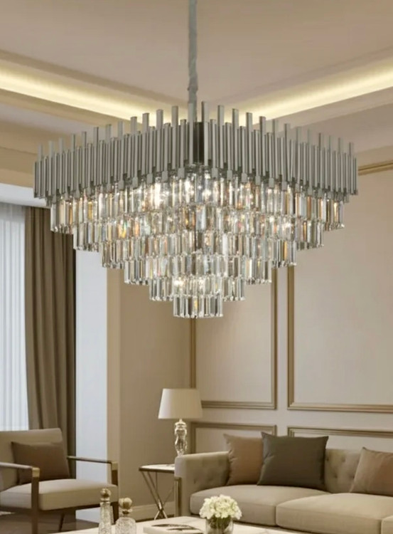 بدنه از لولههای فلزی عمودی با رنگ مشکی مات یا طوسی مات ساخته شده که علاوه بر زیبایی، مقاومت بالایی در برابر خط و خش دارد. آویزهای کریستالی چند لایه با شکست نور بینظیر، فضایی گرم و چشمگیر پدید میآورند و نورپردازی را به شکل یکنواخت در محیط پخش میکنند.