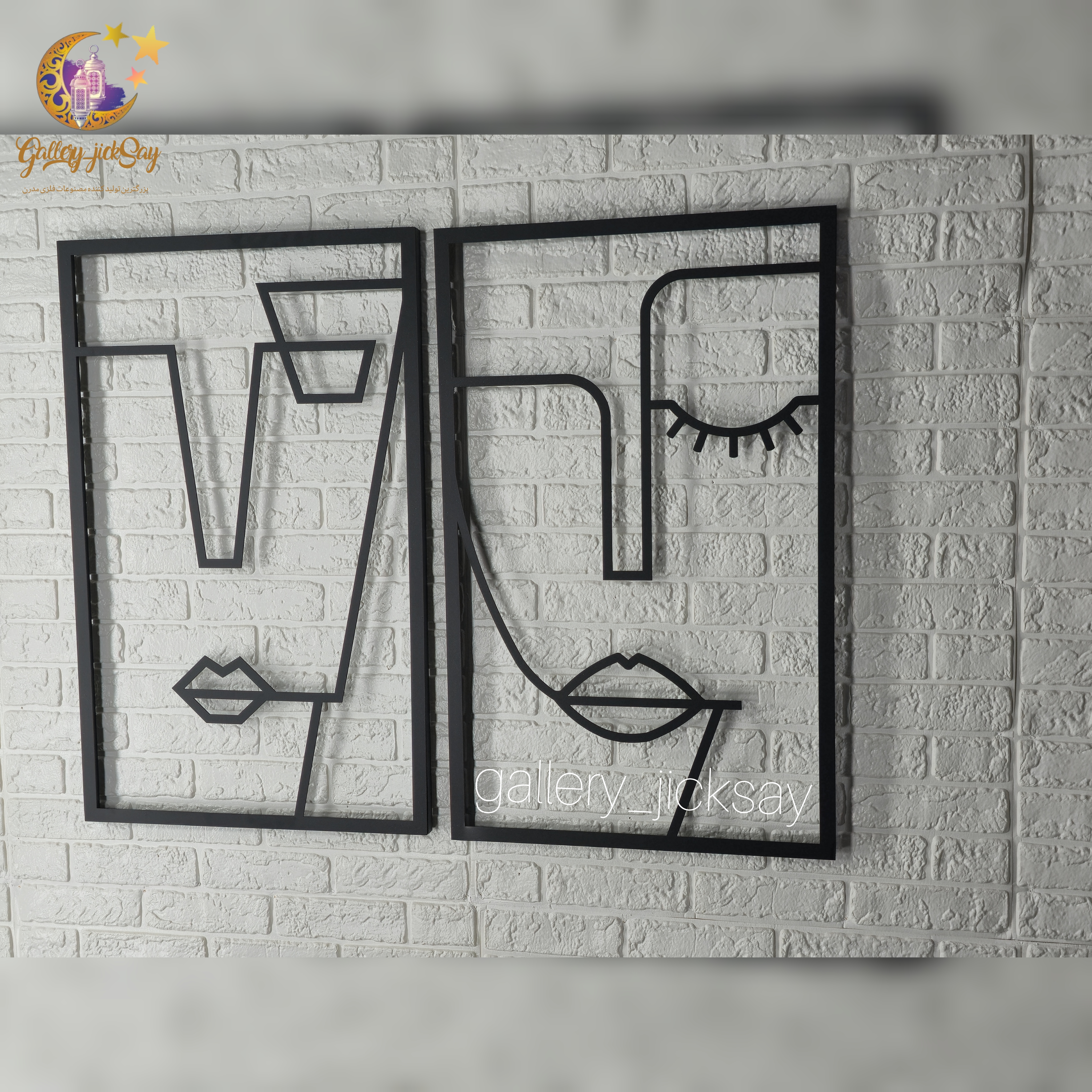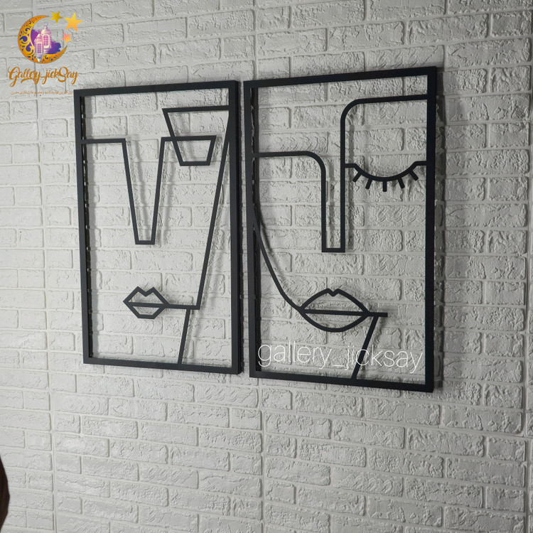 تابلوفلزی دو تکه چهره زن با پیچ و تاب موی سر جهت استفاده در محیط کافی شاپ یا مسکونی می باشد . این تابلو ها از ورق فلزی و توسط دستگاه برش لیزر تولید شده و سپس در کوره های رنگ با انواع رنگ های مشکی ، سفید و طلایی قابل تولید هستند . نصب این تابلو بسیار آسان می باشد و به راحتی با استفاده از دو عدد پیچ و رولپلاک سایز متوسط می توانید روی دیوار نصب کنید .