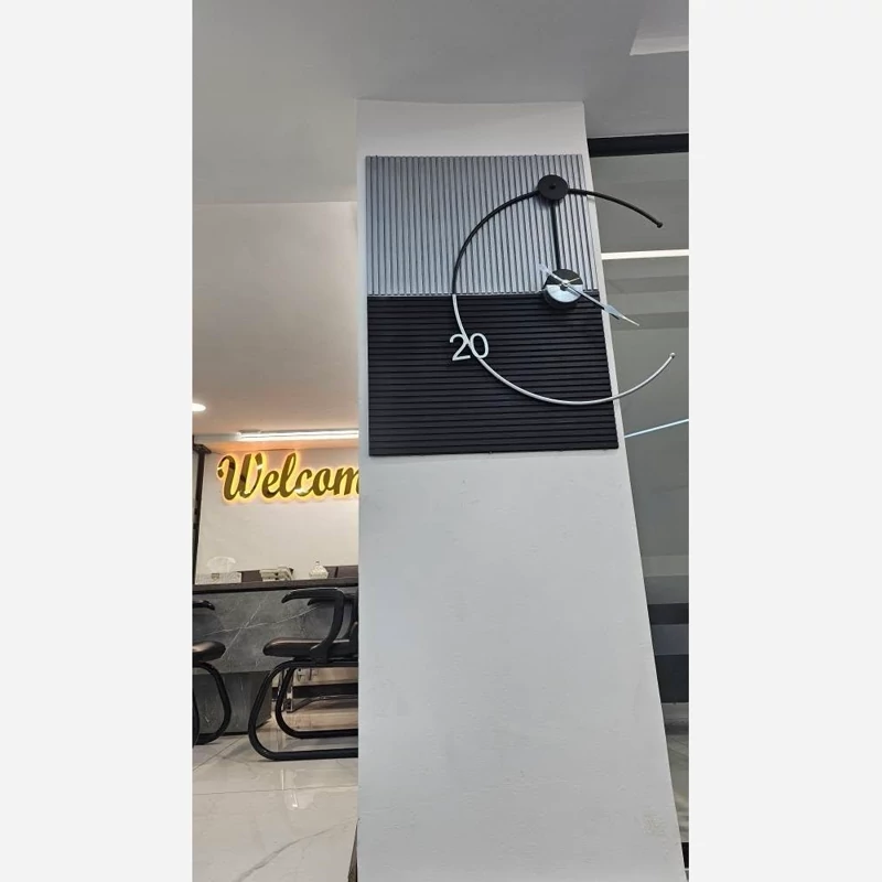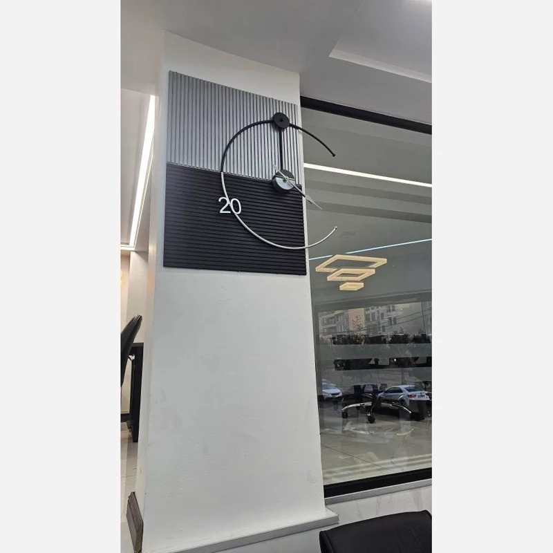 پوشش رنگ کوره استاتیک: بدنه فلزی این اثر هنری با رنگ پودری الکترواستاتیک پوشش داده شده است که کاملاً ضد خش، ضد رطوبت و دارای ثبات رنگ همطراحی دو بافته (Two-Texture): ترکیب پنلهای شیاردار خاکستری و مشکی، تداعیکننده سبکهای مدرن و صنعتی در دکوراسیون است.