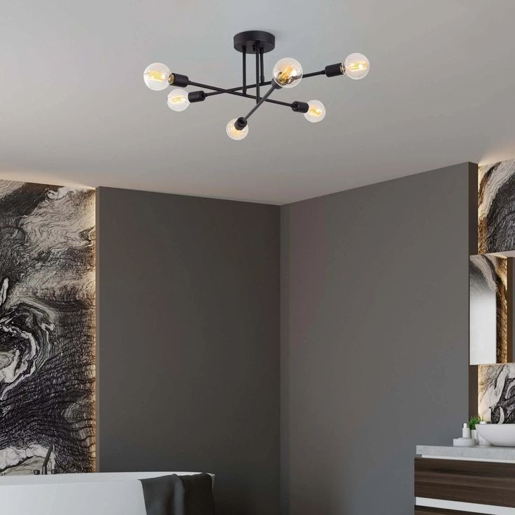 این مدل لوستر از نوع سقفی یا نیمهآویز است و برای فضاهایی که آویز بلند در آنجا امکانپذیر نیست، کاربرد دارد. شاخههای فلزی به صورت متقارن و زاویهدار طراحی شدهاند تا نور را به صورت یکنواخت در سطح اتاق پخش کنند.