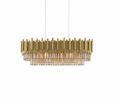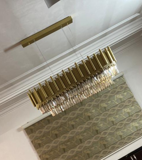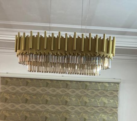 لایه بالایی از میلههای عمودی برنجی/طلایی تشکیل شده که بافت غنی و گرمی ایجاد میکند. لایه زیرین، از هزاران قطعه کریستال تراشخورده ساخته شده که نور را به زیباترین شکل ممکن منعکس کرده و فضا را غرق در درخشش میکند. این لوستر برای مجالس بزرگ، پذیراییهای مجلل و میزهای شام رسمی طراحی شده است