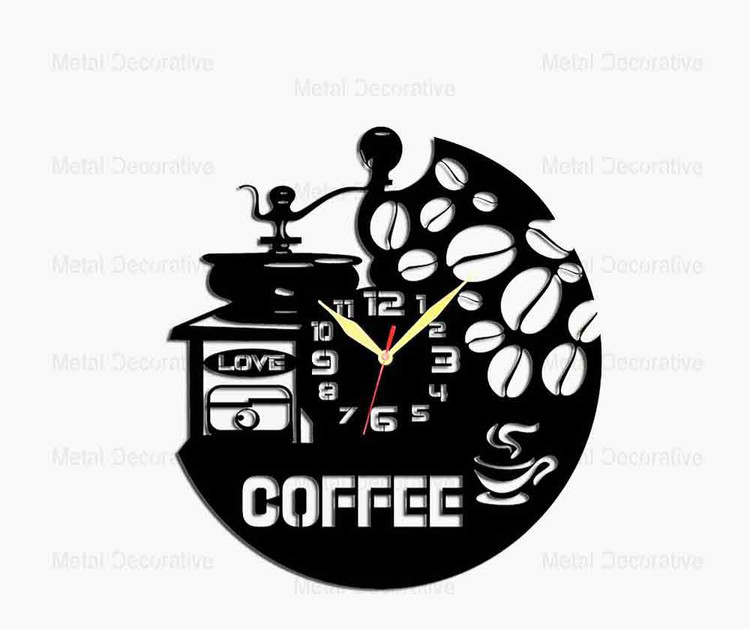 ساعت دیواری فلزی طرح کافی شاپ و دانه قهوهدارای موتور آرام گرد وارداتی بی صدا و موتور گیربکسی برای سایز بزرگ