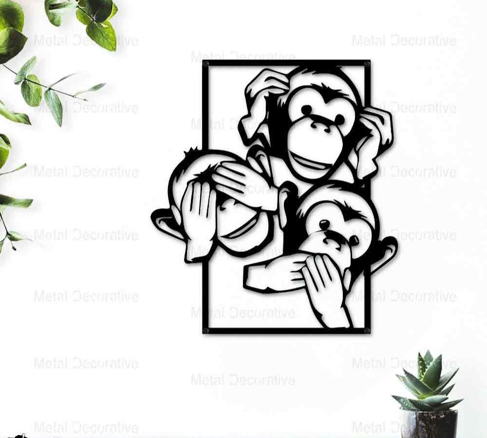 تابلو دکوراتیو تصویر سه میمون باهوش که از افسانه ژاپنی سه میمون کوشین به معنای (شر نگو ، شر نبین و شر نشنو ) الهام گرفته شده . این تابلو ها از ورق فلزی و توسط دستگاه برش لیزر تولید شده و سپس در کوره های رنگ با انواع رنگ های مشکی ، سفید و طلایی قابل تولید هستند . نصب این تابلو بسیار آسان می باشد و به راحتی با استفاده از دو عدد پیچ و رولپلاک سایز متوسط می توانید روی دیوار نصب کنید