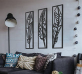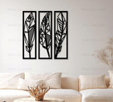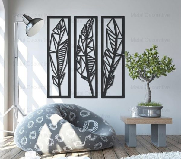تابلو دکوراتیو فلزی طرح پر سه تکه مناسب برای استفاده در دکوراسیون مسکونی و اتاق خواب می باشد. این تابلو ها از ورق فلزی و توسط دستگاه برش لیزر تولید شده و سپس در کوره های رنگ با انواع رنگ های مشکی ، سفید و طلایی قابل تولید هستند . نصب این تابلو بسیار آسان می باشد و به راحتی با استفاده از دو عدد پیچ و رولپلاک سایز متوسط می توانید روی دیوار نصب کنید