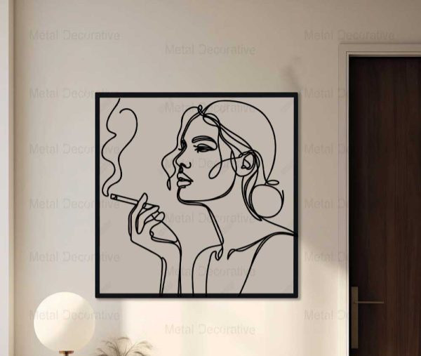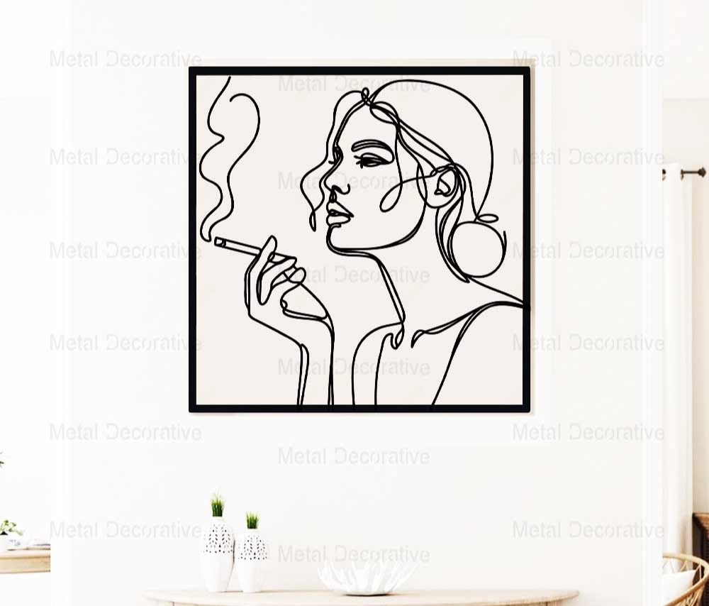 تابلو دکوراتیو زن و دود سیگار مناسب برای استفاده در دکوراسیون مسکونی و اتاق خواب می باشد. این تابلو ها از ورق فلزی و توسط دستگاه برش لیزر تولید شده و سپس در کوره های رنگ با انواع رنگ های مشکی ، سفید و طلایی قابل تولید هستند . نصب این تابلو بسیار آسان می باشد و به راحتی با استفاده از دو عدد پیچ و رولپلاک سایز متوسط می توانید روی دیوار نصب کنید
